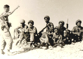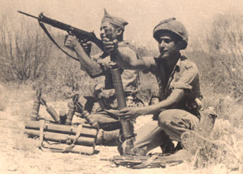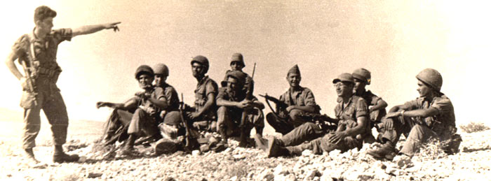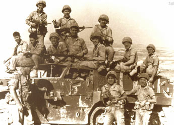 אימון בנגב. מימין למעלה: ישי הוברמן, יורם ברקאי, אליהו כוכבי. שורה אמצעית: שי סלונימסקי, גיורא כהן, יחזקאל דורי, גדיאל סנה, איתן הורוביץ, מפקד המחלקה עוזי צ'פלין ועוזי כהן. למטה: פרוספר חזן, אברהם רינת, הנהג שכטר ומשמאל גדי בהיר. | |