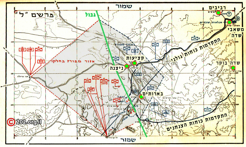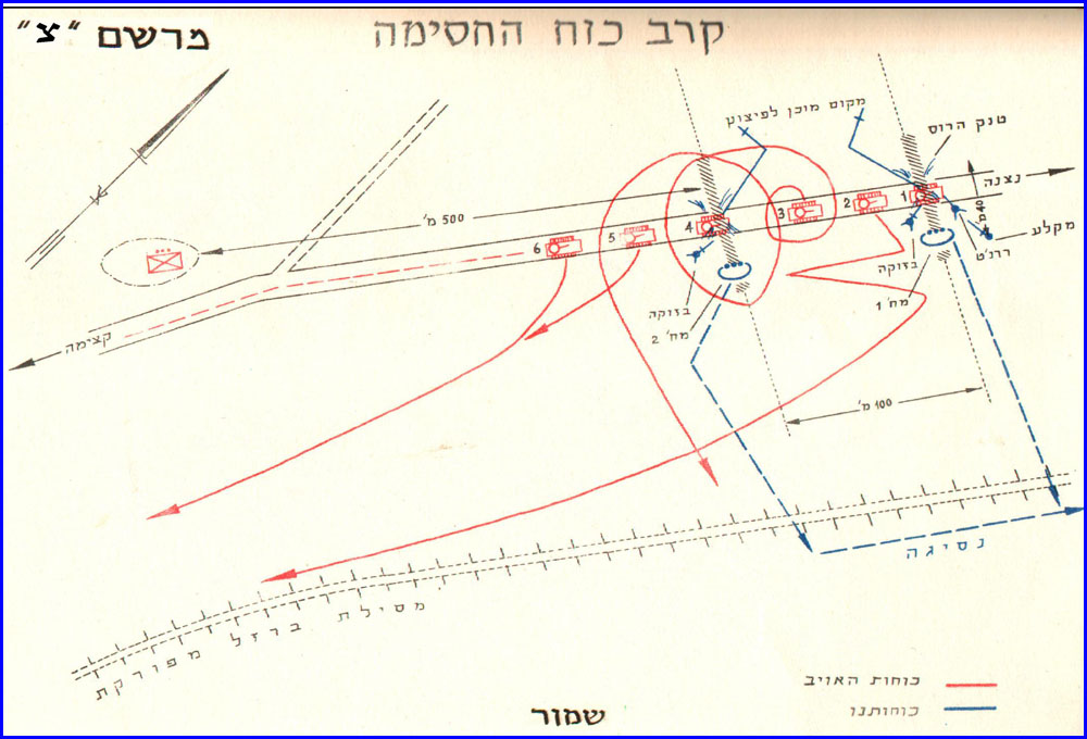 תרשים מבט אלכסוני על המוצבים ותנועת הכוחות, ללא קנה מידה. |